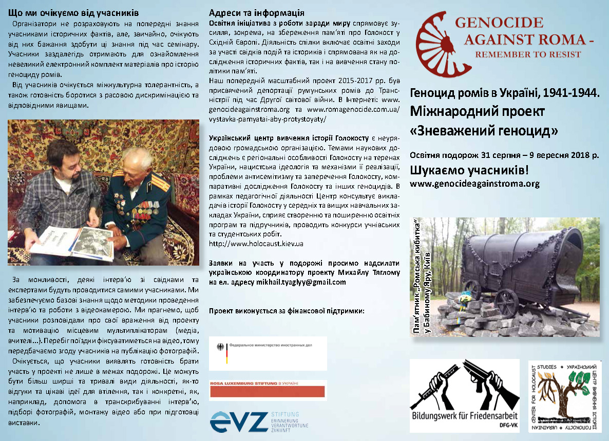 Центральною складовою проекту є спільна поїздка по Україні, в якій візьмуть 10 учасників – по п‘ять з Німеччини та України. Передбачається пропорційна кількість ромів та неромів з обох країн. Освітня подорож триватиме 31 серпня – 9 вересня 2018 року. Учасники проекту братимуть інтерв’ю у свідків подій, відвідають місця масової загибелі ромів та зустрінуться з місцевими громадськими активістами. Участь у подорожі безкоштовна. Організатори покривають витрати на проїзд до початкового пункту поїздки, організовують транспорт для поїздки по запланованих місцях та проживання. Окрім того, виділяються кошти на харчування та забезпечуємо перекладачів. Заявки можна надсилати у довільній формі до 31 липня 2018 року. Докладніше