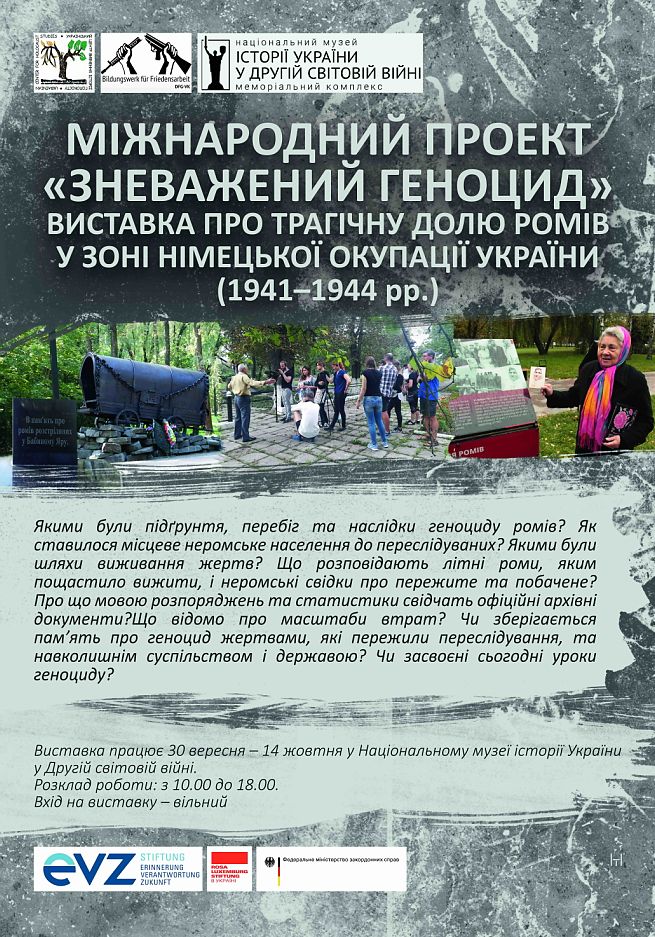 30 вересня о 16.00 у Національному музеї історії України у Другій світовій війні (Київ) о 16.00 відбудеться відкриття виставки, що стала результатом міжнародного проекту «Зневажений геноцид». Доля ромів у зоні німецької окупації України під час Другої світової війни.