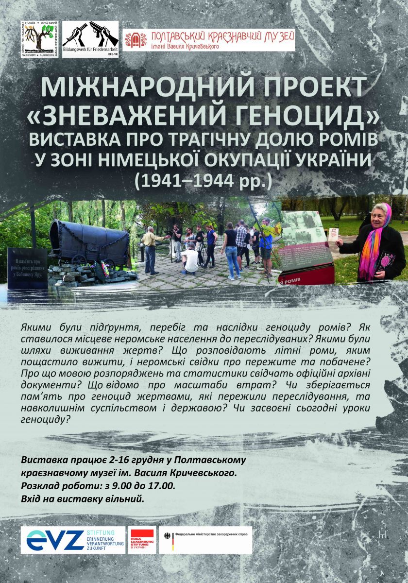 2 грудня о 16.00 у Полтавському краєзнавчому музеї імені Василя Кричевського відбудеться відкриття виставки, що стала результатом міжнародного проекту «Зневажений геноцид». Доля ромів у зоні німецької окупації України під час Другої світової війни. Організаторами є Спілка «Освітня ініціатива з роботи заради миру» (Берлін) та Український центр вивчення історії Голокосту (Київ). Проект покликаний донести до якомога ширшої української та європейської аудиторії історію геноциду ромів України за часів нацизму. Висвітлюється також дискримінація ромського населення та боротьба з нею сьогодні – як в Україні, так і в Німеччині.