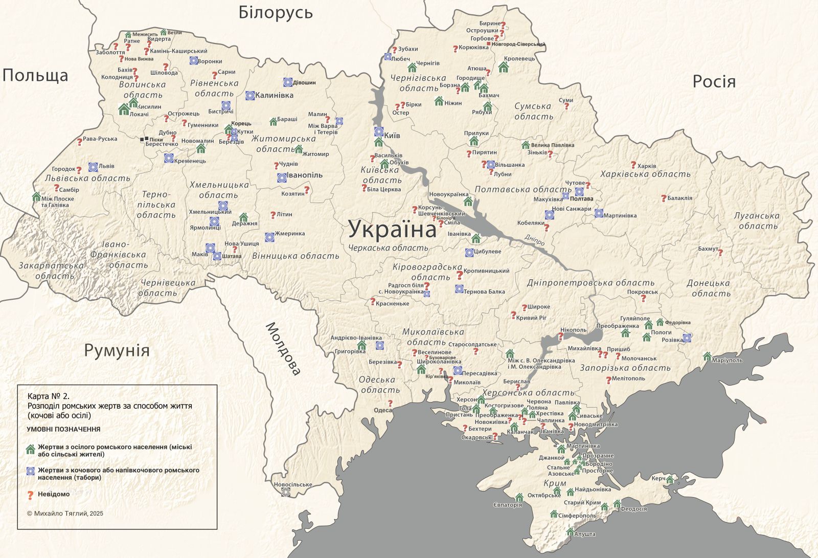 Подані на карті № 2 відомості наочно демонструють правильність цієї тези. З понад 155 випадків масового вбивства на теренах України 53 екзекуцій були виконані злочинцями щодо ромів осілих: або ромів-колгоспників (переважно на півночі й півдні України та у північному Криму), або ромів-містян, які компактно або дисперсно мешкали у Києві, Чернігові, Житомирі, Сімферополі та інших містах. Наприклад, із первинних матеріалів перепису населення 1939 р. відомо, що у Житомирі та інших міських населених пунктах Житомирщини з-поміж найпоширеніших спеціальностей у ромів були токарі, будівельники, лимарі, ковалі, кошикарі, будівельники, вантажники, продавчині, трактористи, возії, прибиральниці. Були кілька службовців, рахівників і директор закладу громадського харчування. Схожу картину демонструють матеріали по інших областях.